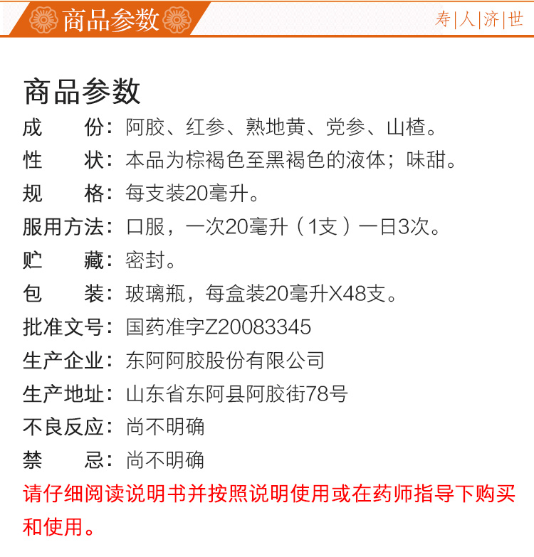 礼袋装】东阿阿胶复方阿胶浆20ml*48支口服液