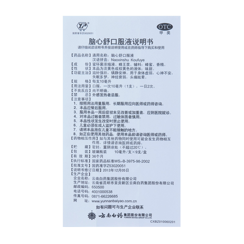 6盒1个疗程】云南白药脑心舒口服液9支